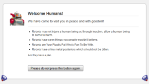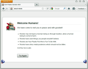 «Пасхальное яйцо» (Easter Egg), заложенное в программный код браузеров (Browser) Firefox и Aurora. В ответ на ввод строки «about:robots» в адресную строку этих браузеров на экране появится следующий шуточный текст: