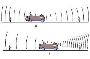 Рисунок: а — оба наблюдателя на тротуаре слышат звук сирены стоящей на месте пожарной машины на одной и той же частоте; б — наблюдатель, к которому приближается пожарная машина, слышит звук более высокой частоты, а наблюдатель, от которого машина удаляется, слышит более низкий звук.