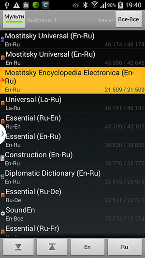 Мультиформатная оболочка для электронных словарей для устройств на базе Android (вер. 1.5 – 4.4). Поддерживает форматирование, цвета, звуки, картинки и морфологию Hunspell. Работает с форматами словарей Lingoes (.LD2), Babylon (.BGL), ABBYY Lingvo (.LSD, .DSL, .LSA и .DAT), StarDict, Dictd.