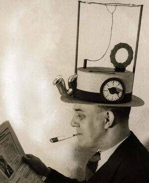 Фото: Портативная радиостанция в соломенной шляпе, созданная американским изобретателем, 1931 год.