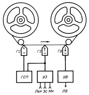Высококачественные катушечные магнитофоны имеют раздельные усилители записи (УЗ) и воспроизведения (УВ) и раздельные магнитные головки, которые при записи работают одновременно и образуют так называемый сквозной канал. На рис. 2 показана структурная схема катушечного магнитофона-приставки со сквозным каналом. Сквозной канал позволяет во время проведения записи контролировать её качество непосредственно с фонограммы и осуществлять ряд дополнительных функций.
