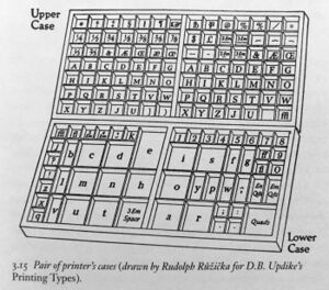 Рисунок: Наборные типографские ящики. При ручном типографском наборе заглавные буквы располагались в верхнем ящике наборной кассы.